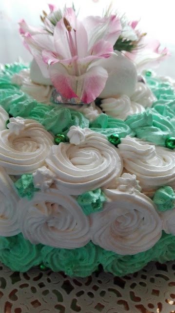 Ho aggiungo del colorante verde, confettini di zucchero verdi e fiori freschi sul rosa.